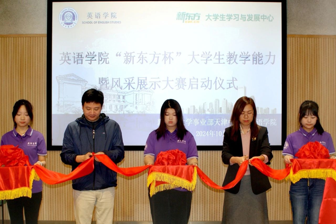 随后,刘海燕与宗琦共同为“新东方杯”大学生教学能力暨风采展示大赛剪彩。