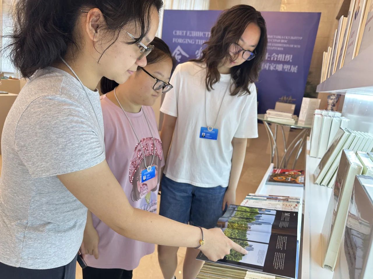 路队成员聆听了多位嘉宾的精彩发言。会后,路队成员意犹未尽地翻阅现场展出的上合组织相关主题书籍。成员们围绕“命运共同体”与“文化软实力”展开热烈讨论,有同学不禁感慨道:“书里写的是国家之间的对话,但我们能用自己的英语专业特长,把这些大叙事翻译成青年可以参与的表达。”