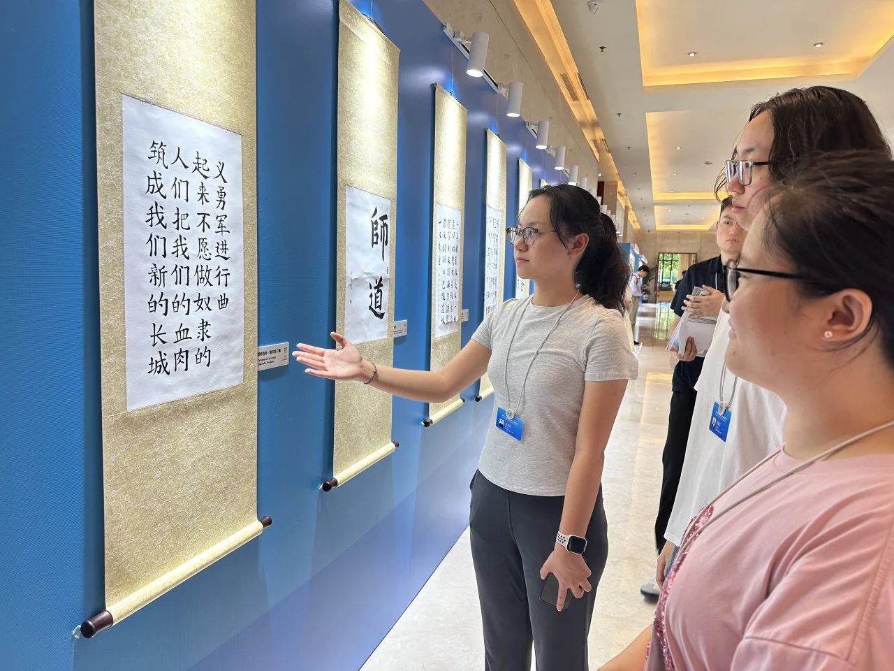 走进展厅,路队成员在丰富多样的艺术作品中,看到了文明的多样性与包容性,也更加坚定了通过语言与文化传播,提升天津国际化形象的信心。展区内还设置了非遗体验互动区,路队成员还现场体验了杨柳青木版年画的印制工艺。沾墨、拓印的过程看似简单,但每一步都蕴含着匠心和传承。路队成员深刻体会到,文明互鉴从不是遥远的外交词汇,它也可以是一次印章的落纸、一笔一划的书写、一尊雕塑的凝视。文化是最柔软的力量,也是对话世界最有底气的声音。